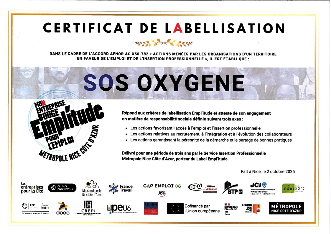 SOS OxygĂšne vient dâobtenir le label Emplâitude MNCA, une distinction portĂ©e par la MĂ©tropole Nice CĂŽte dâAzur. Ce label valorise les entreprises qui sâengagent concrĂštement pour lâemploi, la diversitĂ© et lâĂ©galitĂ© des chances. Une reconnaissance qui souligne la volontĂ© de lâentreprise de mettre lâhumain au cĆur de sa stratĂ©gie et de ses actions RH.