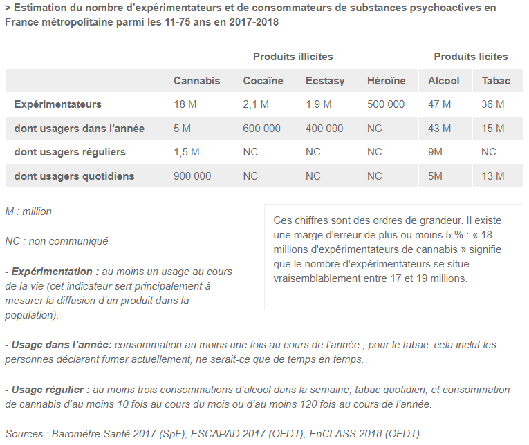En France, il existe des drogues autorisées mais réglementées, comme l’alcool et le tabac ou encore certains médicaments, et des drogues interdites dont la loi proscrit l’usage et la vente, comme le cannabis, l’héroïne ou la cocaïne. Enfin de nouvelles drogues apparaissent sur le marché sans que leur statut soit encore clairement défini. L’autorisation ou l’interdiction d’une drogue n’est pas strictement fondée sur sa dangerosité. D’autres facteurs entrent en ligne de compte (histoire, culture, intérêt thérapeutique). Les drogues sont également classées selon le type d’effets qu’elles procurent :